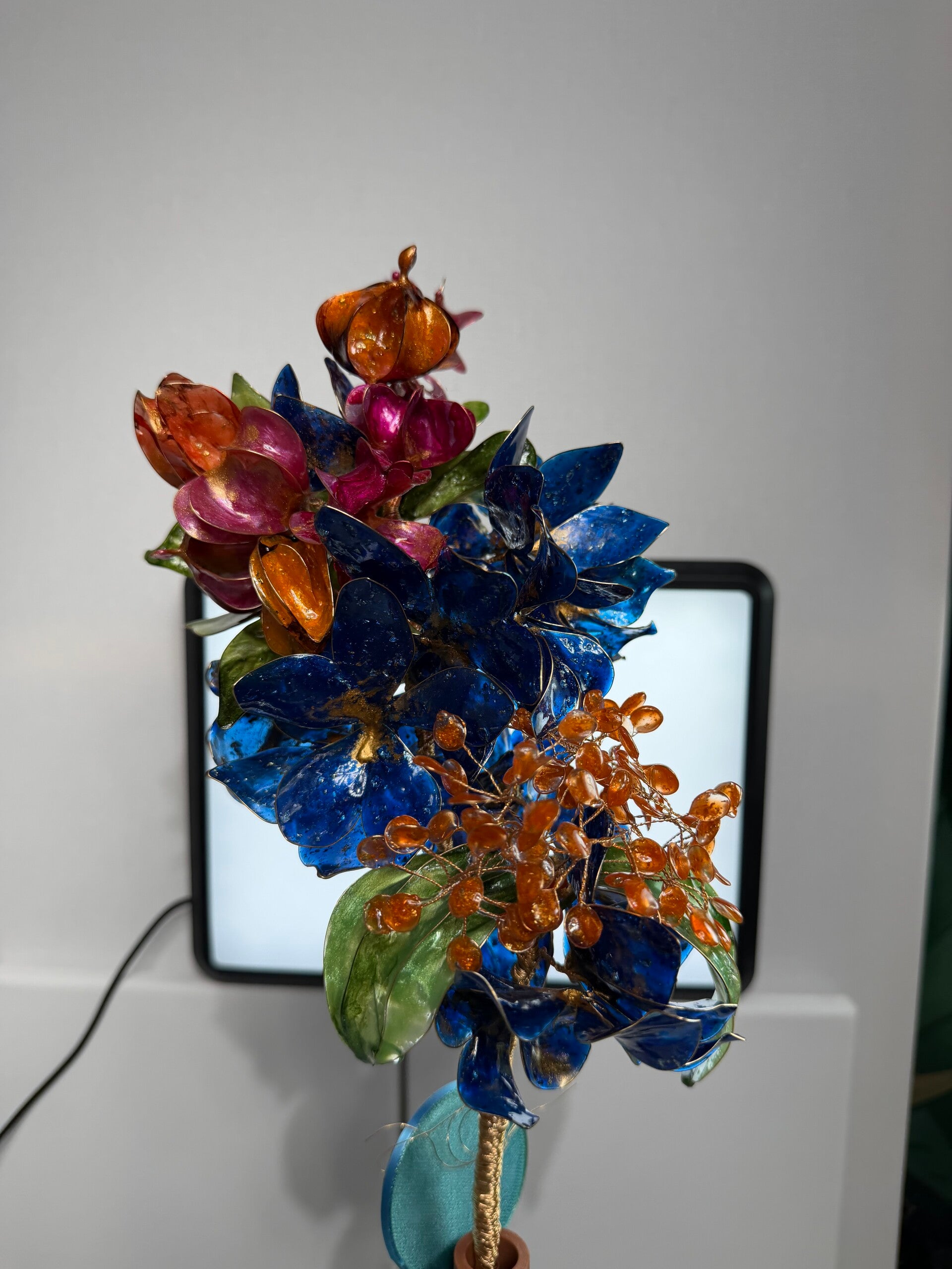 Ein kunstvoll gefertigter Blumenstrauß aus Epoxidharz, liebevoll von Hand auf einer feinen Drahtstruktur gestaltet. Die filigrane Verarbeitung macht dieses Deko-Objekt zu einem besonderen Blickfang.