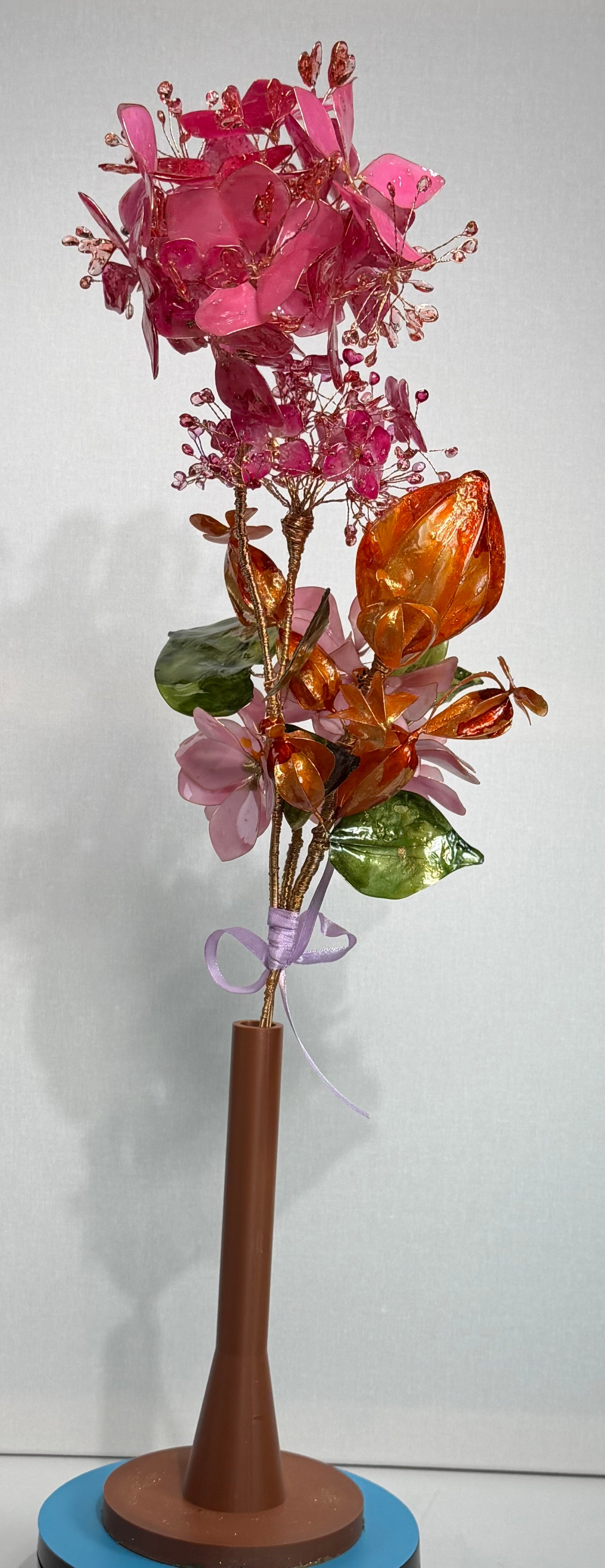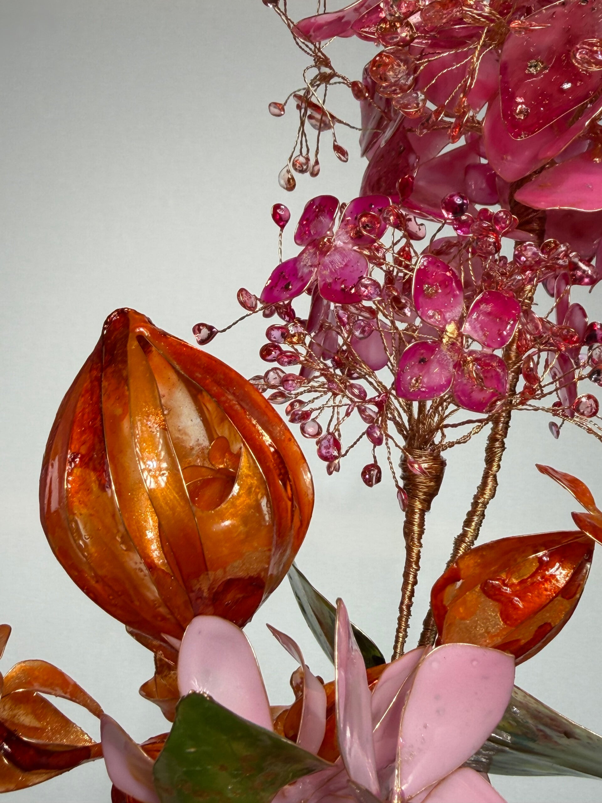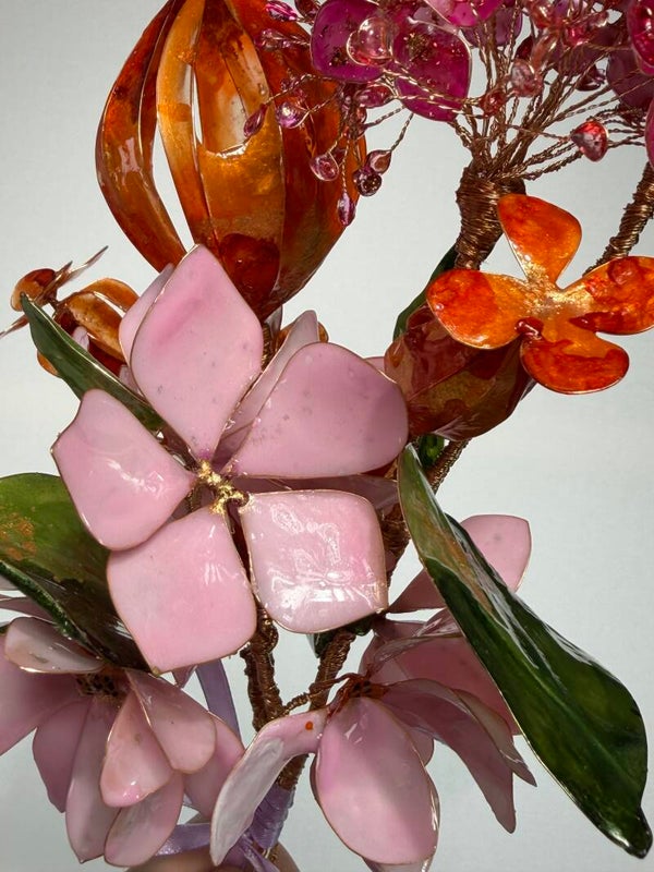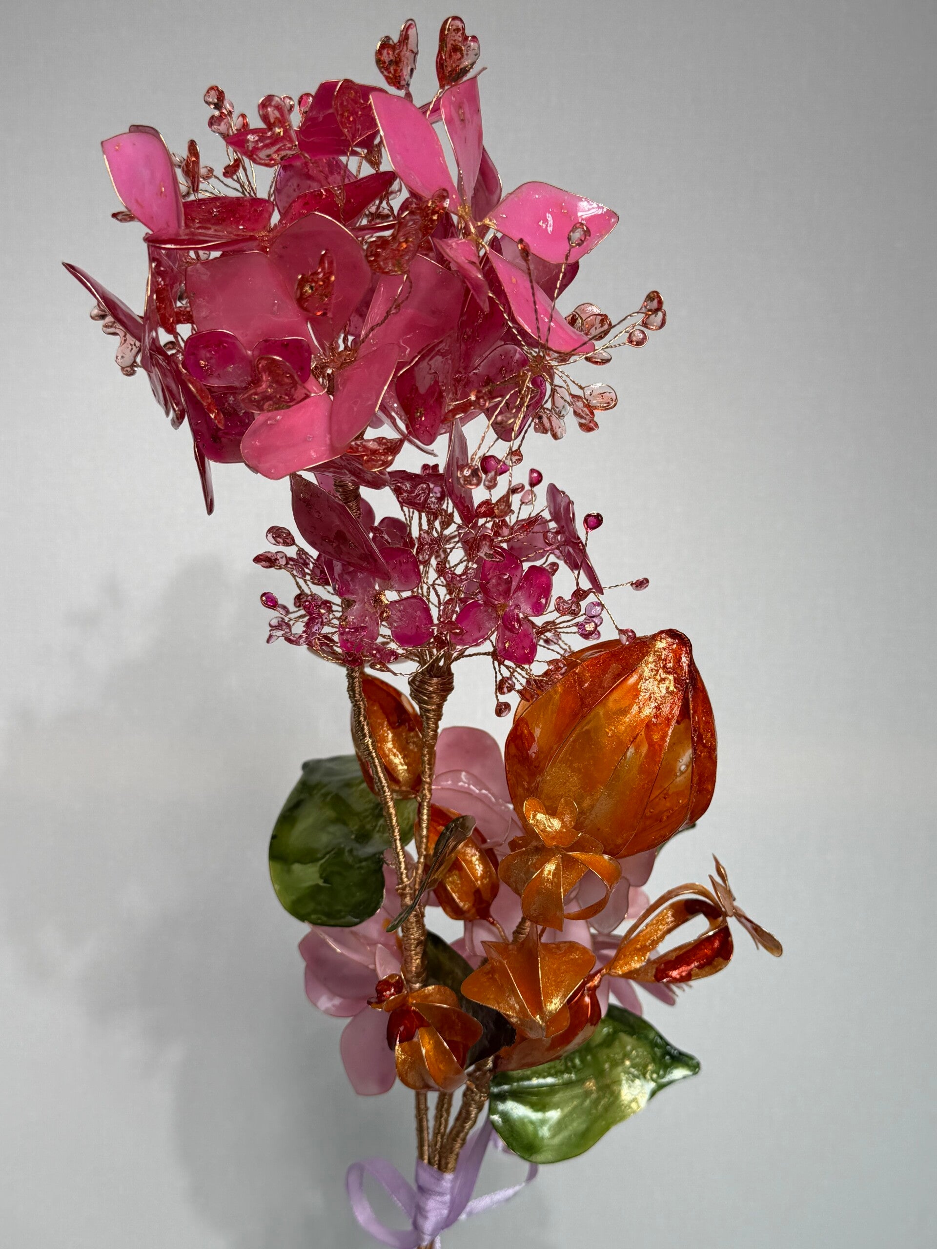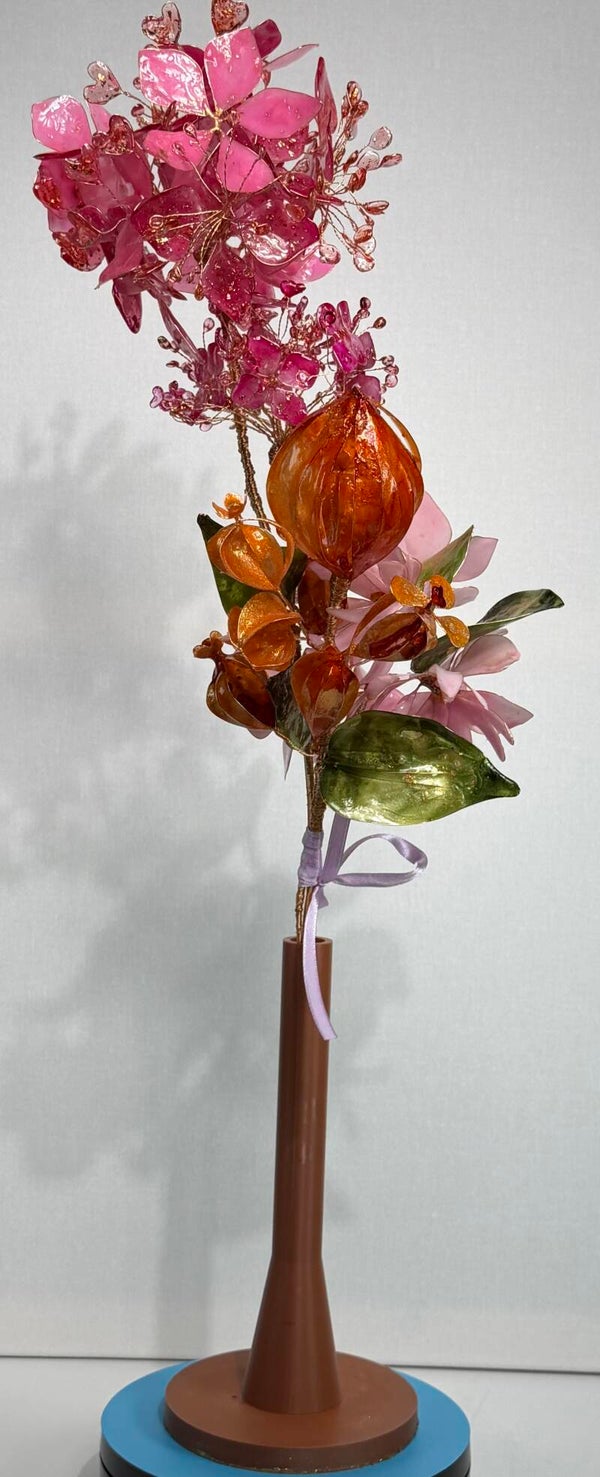 Dieser exklusive Blumenstrauß ist ein kunstvoll gefertigtes Unikat, das mit viel Liebe zum Detail aus hochwertigem Epoxidharz hergestellt wurde. Die filigranen Blüten werden von Hand auf einer feinen Drahtstruktur arrangiert und verleihen dem Arrangement eine elegante, fast schwebende Leichtigkeit.