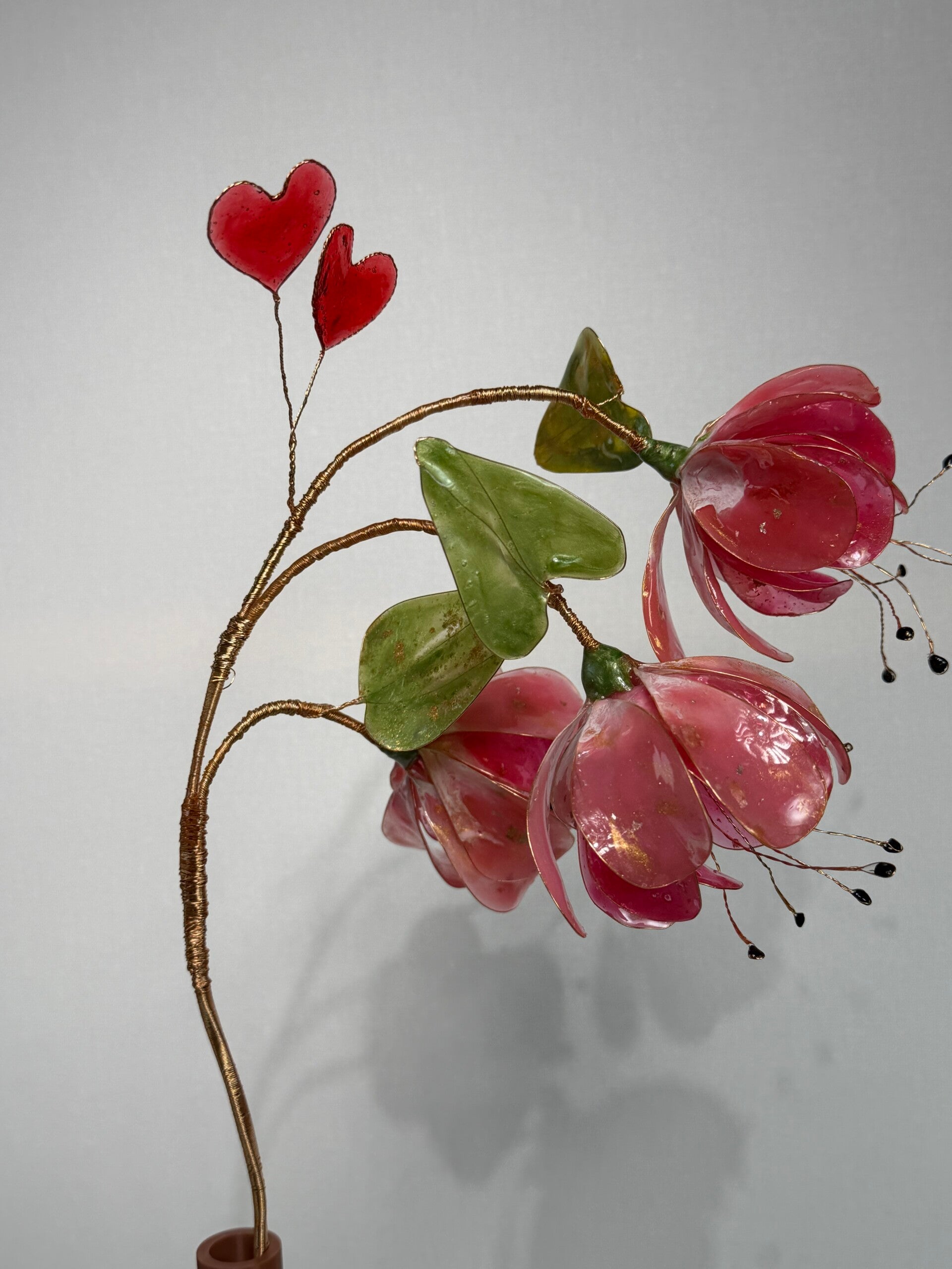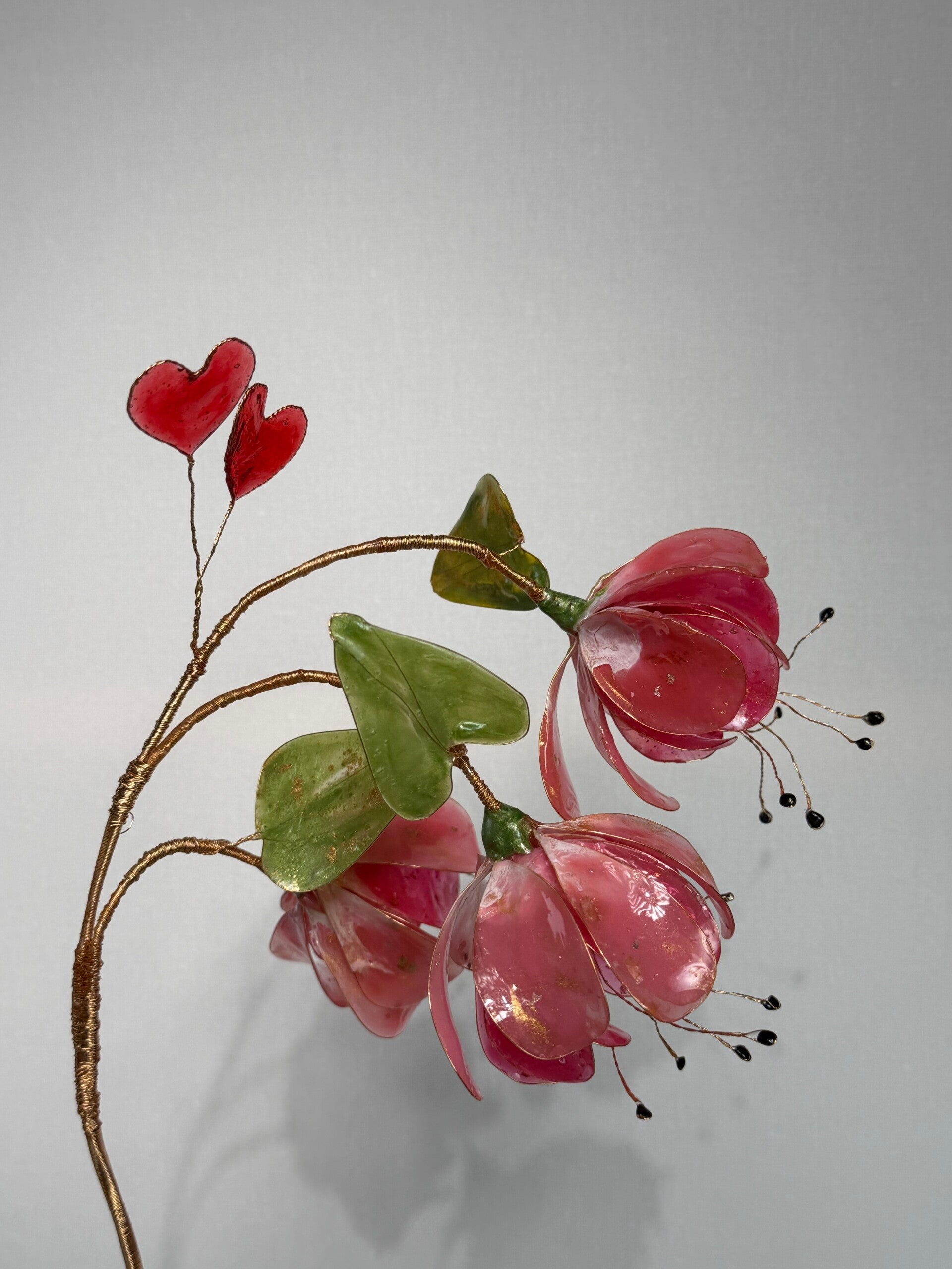Ein stilvoller Blütenzweig aus Epoxidharz, in sorgfältiger Handarbeit gefertigt und auf einer feinen Drahtstruktur kunstvoll arrangiert. Die harmonische Form und die edlen Details verleihen diesem Unikat eine besondere Ausstrahlung.