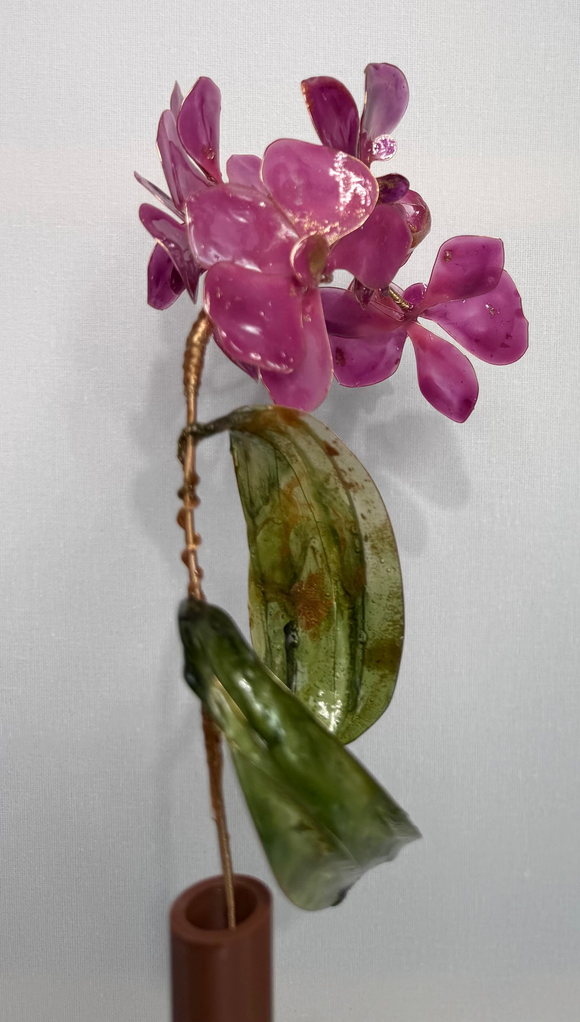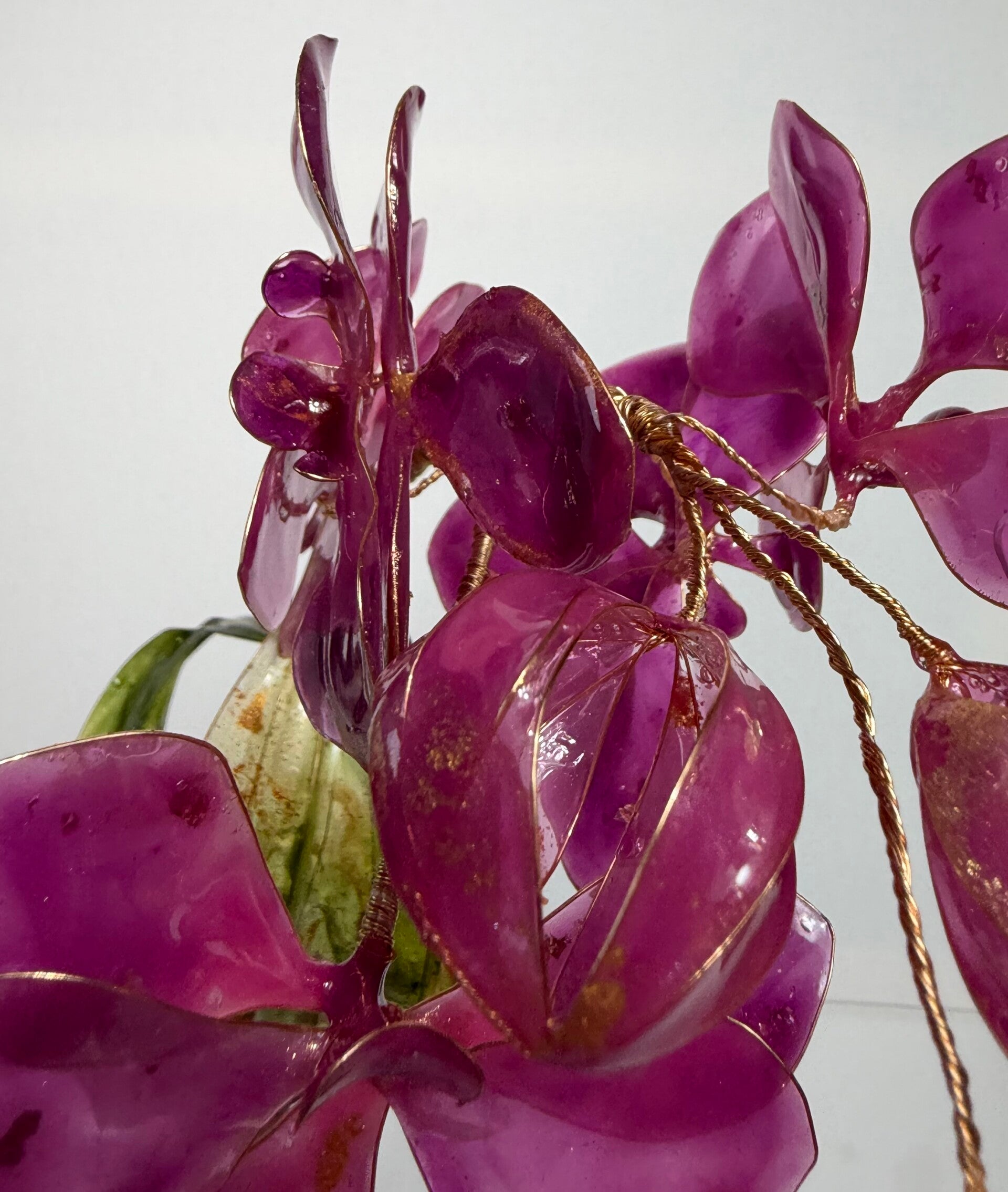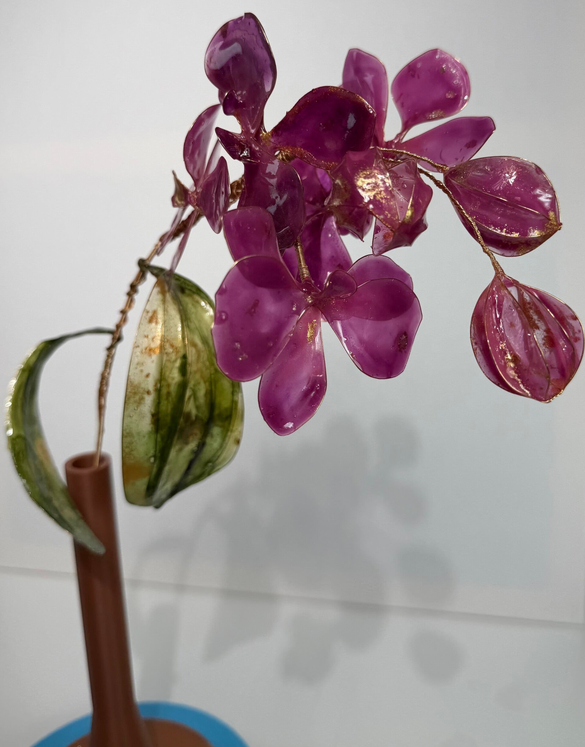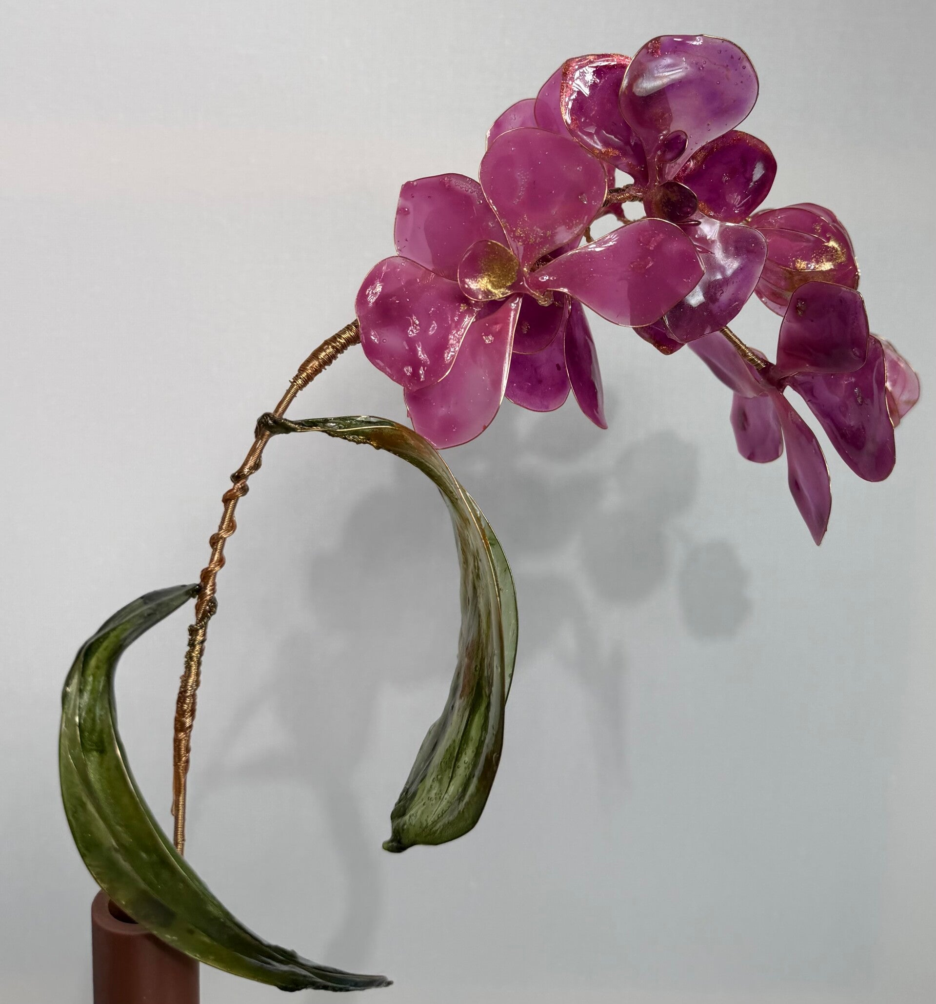 Eine kunstvoll gefertigte Einzelblüte aus Epoxidharz, sorgfältig von Hand auf einer feinen Drahtstruktur gestaltet. Die klare Formensprache und die edle Farbgebung verleihen diesem Unikat eine besondere Leichtigkeit und Eleganz.